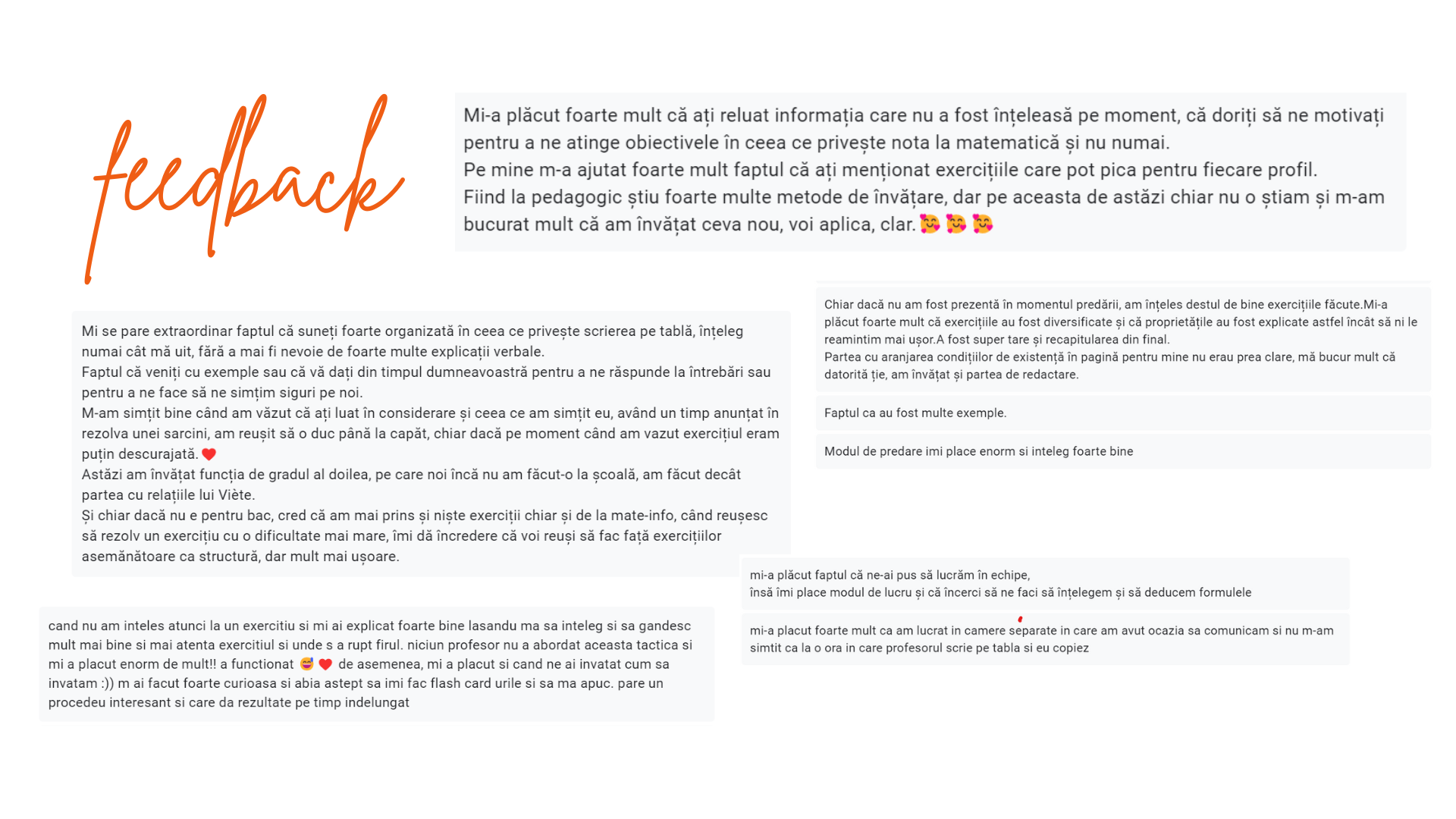 Mi-am depasit limitele si am cautat continuu o cale mai buna de a explica tot ceea ce la scoala era neclar. Am creat fise, videoclipuri, postari - zeci si zeci de materiale gratuite pe care ulterior le-am dezvoltat, perfectionat si prezentat in fata audientei mele sub forma unor cursuri, lectii intensive, pregatiri in grup .
